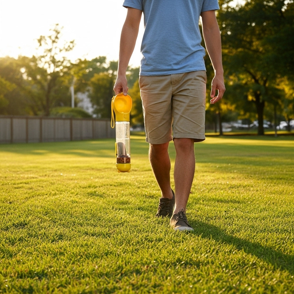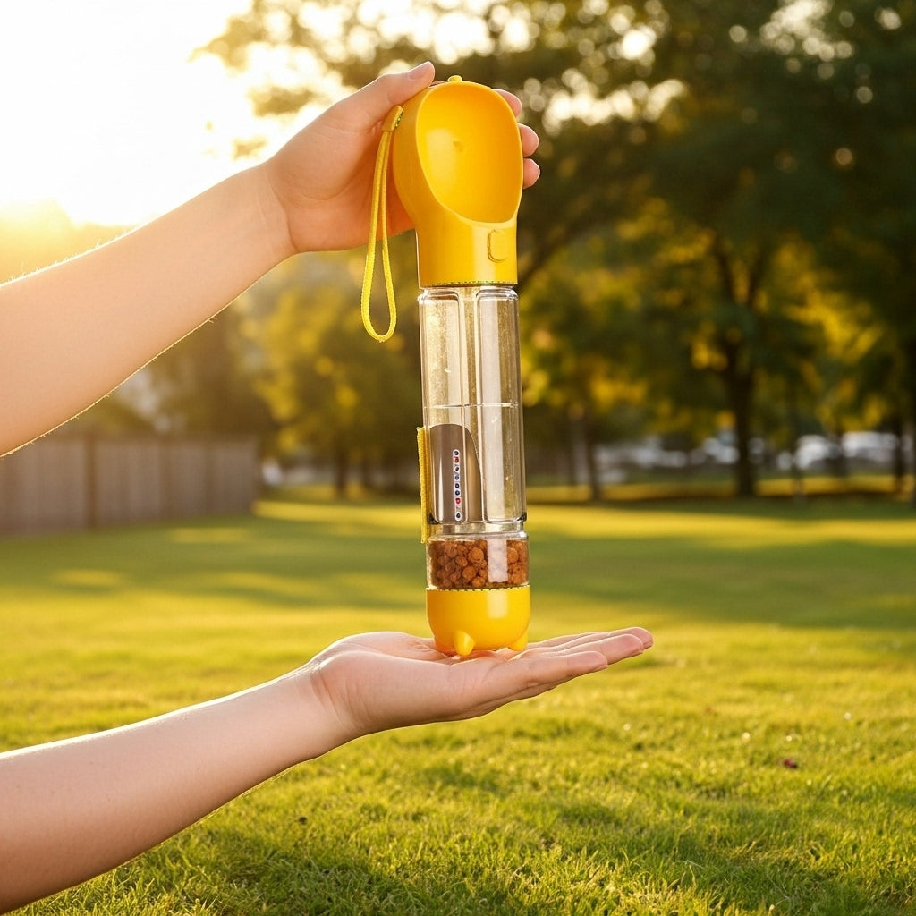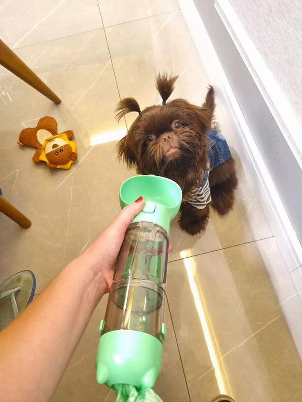 Discover the ultimate convenience for caring for your pet during walks, hikes, or trips with our 4-in-1 Pet Walking Bottle. Designed for life on the go, this smart and portable solution combines everything you need in one sleek product. Keep your pet hydrated, store food or treats, and handle cleanups quickly and hygienically wherever you are. Enjoy more freedom, organization, and peace of mind on every walk. Complicated outings are a thing of the past.