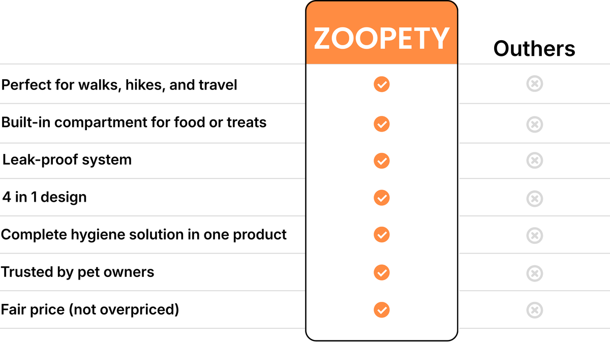 Say goodbye to unprepared outings with the Zoopety 4-in-1 Pet Bottle. This compact and smart solution brings everything your pet needs into one convenient design water, food or treats, and cleanup essentials so you’re always ready, wherever you go. Perfect for walks, hikes, or travel, it fits easily into your bag and delivers comfort, organization, and peace of mind every step of the way. Enjoy smoother, simpler walks without the hassle.
